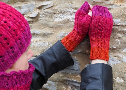 I Love A Theme Fingerless Mitts feature a simple rib and minimal lace pattern, and long cuff to keep out the wind in winter. They were designed to use up my leftover Lyra gradient set from a cardigan sample, using the same lace… I named them for my friend Dorothy, who loves a theme. There are a matching hat and cowl also available.