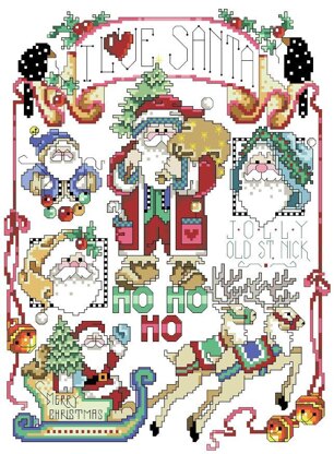 By Barbara Baatz Hillman. This Santa Sampler is full of reminders of the Christmas Season. Charming little motifs surround Santa in his sleigh as he sails off to delight children with his bag full of gifts.