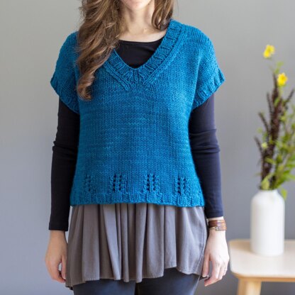 Ice Breaker is a sleeveless layering top/popover, perfect for winter layering! And knit up seamlessly and in bulky-weight yarn, it’s a fun, fast knit too. It features a deep v neckline and simple eyelet stitch details along the hem.