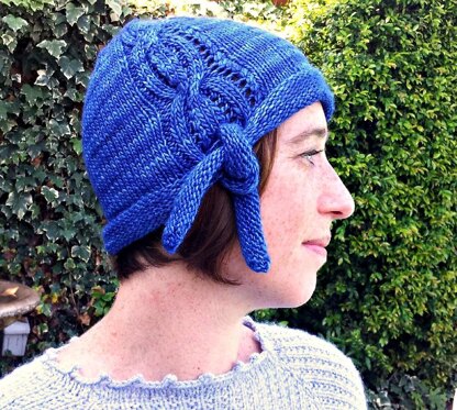 It features a decorative knotted tie, which also gives the benefit providing an adjustable and perfect fit. The knitting begins with the tie, worked flat in reverse stockinette stitch so it naturally curls inward. A lacy cable accentuates one side of the hat while the rest is in smooth stockinette stitch. The hat can be made in a slouchy style if desired.