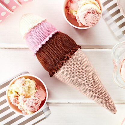 Here’s a cool knit, a big garter stitch cornet with three scoops of delicious vanilla, chocolate and strawberry ice cream. Make your ice for a larger toy or as a sweet scatter cushion. Designed by Amanda Berry @fluffandfuzz, the ice cream is knitted in acrylic 4-ply yarns on single pointed needles (not in the round). This pattern incorporates a frilled cast on and 3 needle join, and step by step instructions are included. For confident beginners and above, other techniques used include casting on and off, knits, purls, increases and decreases, and seaming to finish.