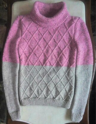 The ice cream sweater is a beautiful two color cosy sweater with turtle neck. The pattern of the sweater is easy and the colors used are very beautiful and enjoying to knit. The pattern is written for small size woman. the guage of the pattern is 18 stitches * 24 rows = 10 cm * 10 cm