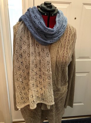 This shawl was designed to dress up holiday outfits, or to keep you a bit warmer during spring and fall evening events. The lace has a great snowflake detail on it that gives visual interest. The pattern can be repeated until the wrap is the length you like, and can be repeated until you have used up as much yarn as you can.