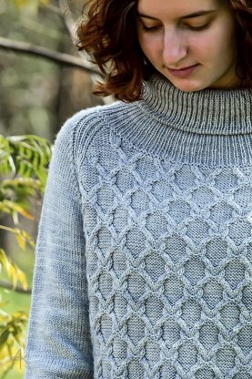 The pullover is knitted bottom-up and in the round. Sleeves are knitted in the round then joined with the body. Then the yoke is worked as one-piece. Neckline stitches are picked up from the edge and worked in the round. Only two tiny seams are required at the underarms.