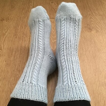 The icy cable socks have a cable and lace panel running down the front of the ankle and foot. The heel and toe are worked seamlessly using short row shaping.