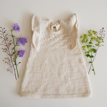 This beautiful dress with its lovely butterfly pattern and the ruffles is worked from bottom to top, up to the armholes in the round, then the front and back are finished separately in back and forth rows. Apart from the two small seams at the shoulders it's seamless.