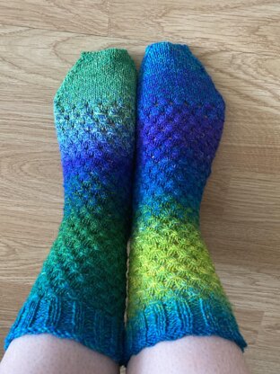 The stitch pattern on these socks reminded my friend of a mermaid’s tail, but of course a mermaid would have no need of socks. But if mermaids had feet, these socks would be perfect! The socks are worked top-down using a Strong heel. The stitch pattern is given as written instructions only.