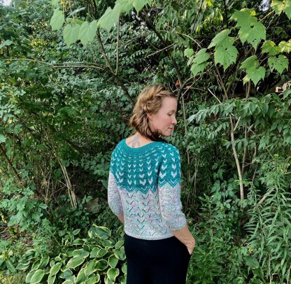 This sweater is worked in the round from the top down. Short rows are worked across the back for slight shaping. After the yoke the sleeve stitches are placed on waste yarn or spare needles to be picked up and worked in the round. The body stitches are continued in the round using the SMALLER NEEDLES and a simple lace motif to the bottom hem. The sleeve stitches are then picked up and continued in the round again with the SMALLER NEEDLES and the simple lace motif. The sleeve length can be modified, but if you want to knit them longer you will need to have a little more yardage than the pattern calls for.