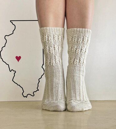 Illinois is a state known for its major city, Chicago, but did you know that Illinois also has forests, cliffs, rolling hills, and gorges? The middle of the state is covered in wheat, pumpkin, and corn fields. This sock shows off the rolling hills at the southern end of the state and the wheat fields in the middle.
