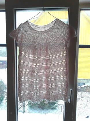 "Ilmava" means "airy" in Finnish. It is a light mohair-linen top that can easily be turned into a sweater. If you don't have the original yarn, you can use lightweight wool (merino, alpaca etc.) 100 g/1400-1500 m held together with mohair 25 g/210-250 m.