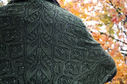 This shawl shows a forest through the seasons. It starts in spring with lily of the valley, next is summer with leaves fully grown, and ends with autumn, with the acorns grown. The added beads in the edge give a sprinkling of snow.