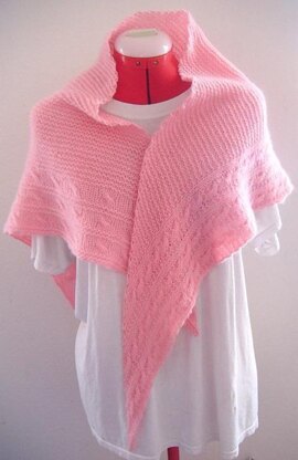 It is worked sideways from cast on one stitch and increased one stitch at the end of every other row to binding off. It is asymmetrical with the first border knitted at the same time as the body. Any yarn and colour will be great for it. Gauge is unimportant.