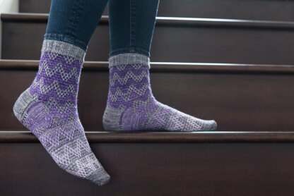 Playing with colors while knitting can be a challenge and many knitters shy away from it. Mosaic knitting is a chance to make the impossible possible… a way to give the illusion of stranded colorwork while only working one color at a time. Worked from the toe-up, these socks pair stunning gradient mini-skeins with a semi-solid neutral to create a graphic and eye-catching design. Give them a go and redefine your idea of what is possible!