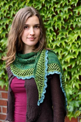 This beautiful shawl is a quick knit and works especially great for showing off yarns with long colour changes. You can knit it in any yarn quality and change its size as you like. There are two options given for the scalloped edge, one for smaller and one for bigger scallops. Photo tutorial included. You can knit this shawl with the matching In Bloom fingerless mittens