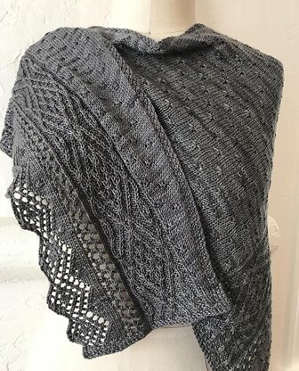 This lovely sport weight shawl, worked as a triangular wedge / vortex, incorporates an Aran lace and geometric side edging, with a textured body. The versatile shape can be worn a variety of ways!