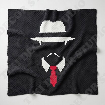 Beginner-friendly, created using the Corner-to-Corner crochet technique. A minimalist graphic composition features the unmistakable incognito hat with a stylized tie and collar, forming a clever Italian mafia design. High contrast between dark background and light elements gives the pattern a clean, modern look for tech, gamers, and fans of internet culture. Sharp lines and simple shapes create a bold statement piece suited for offices, gaming rooms, or contemporary spaces.