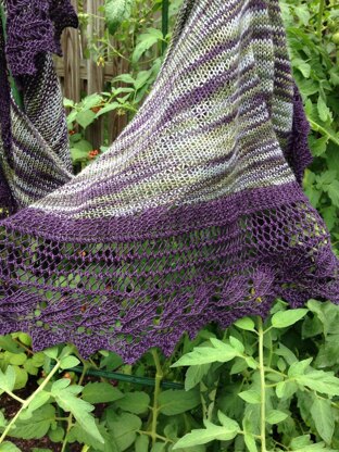 The shawl begins with a sideways knitted border. After the border is the appropriate length, stitches are picked up along the side and the body is worked in either stockinette or garter. Some minor math is required to do the shaping.