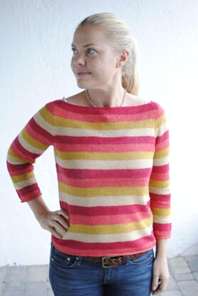 This sweater is knitted top down with a seamless set in sleeve. A faux seam is added along the sides to prevent the linen yarn from twisting . The pattern includes instructions for crocheted edgings and jogless stripes.