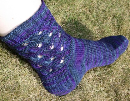 Make these socks using solid or semi solid yarn to show off the stitches, or with multi-coloured yarn to show off the yarn. The Indian Cross stitch that forms the legs looks more complicated to work than it is, and the plain stocking stitch foot allows the leg to take all the glory. The socks are worked toe-up with a flap-and-gusset heel. Three sizes are offered, Small (to fit 7”/18cm foot circumference), Medium (to fit 8”/20cm foot circumference) and Large (to fit 9”/23cm foot circumference) when worked to pattern tension of 9 sts to 1”/2.5cm.