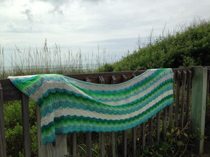 Infinite Surf is a rectangular wrap with lace and texture stitches reminiscent of waves, sea foam, and the infinite power contained in the surf. The lace and texture stitches are straight forward and easy to memorize, making this a satisfying knit for newer lace knitters, but challenging enough to keep a more seasoned knitter interested.