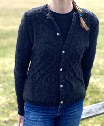 This soft, warm cardigan is named after the cable it features, which I based on the infinity symbol. The yarn is so soft that it feels great against your skin and is perfect for wearing over a t-shirt. The pattern includes instructions for sizes ranging from a 32 inch bust up to a 50 inch bust. It is fast and easy to knit with simple, step-by-step instructions that include options for customizing the length of the sweater. Mine is knit in Cascade Spuntaneous Worsted in Jet Heater. It takes 6-8 skeins, and is knit on US 7 needles.