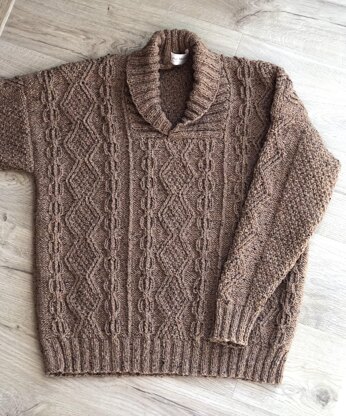 This lovely relaxed fit sweater has diamonds infilled with double moss stitch which are also replicated on the sleeves. The panels are divided up with interesting twist stitch cables, and columns of single twisted rib. Cuffs and welt in 2/2 rib. The matching rib cross-over inset collar has simple shaping along the inner edge. A great design for men or women. Worked bottom up, and with full written instructions.