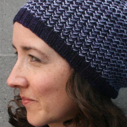 The perfect hat for special DK or worsted yarns. This design is ideal for semi-solid colours. Worked in two shades, the strands of yarn look like they have been inked over the top of the other.