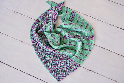 The Inscribed Diamonds Shawl features two different types of diamonds inscribed over the background of the shawl. The triangular shawl is worked from one vertex, increasing along one edge and slowly decreasing along the other. The shawl pattern is written for one main color and one contrast color, but can also be a playground for colors! The pattern includes 4 sizes, instructions to adjust the size of your shawl, and color suggestions to customize your shawl.
