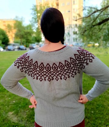 This seamless sweater is knitted from top down with German short rows to give shape to the neckline. Simple body and long sleeves gives credit to the colorwork pattern in the yoke. The pattern is written to have 4" / 10 cm of positive ease in the chest. There are sizes from XS to 5XL to choose from.