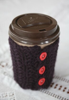 Keep your coffee warm while you are out and about with this easy, quick-to-knit cup sleeve. Mistake rib forms the stitch pattern and the cosy is buttoned snugly closed along one edge.