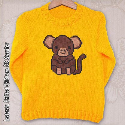 A picture of a monkey, baboon, chimp, a cute animal sweater inspired by the Chinese zodiac. Pattern includes chart for the image and written instructions for the sweater. I recommend using intarsia technique for the block colours and duplicate stitching the details.