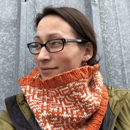 The Interconnected Cowl is a soft, cozy, slipped stitch cowl knit in worsted weight cotton yarn, comfy for those with sensitive skin and in transitional weather. The bold motif uses only one color per row; some stitches are slipped to create upward movement of the alternate colored lines without stranding. This cowl reminds me of how we are all interconnected, though sometimes that connection is through another.