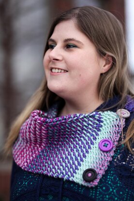 Keep brisk winds and frozen temperatures at bay with the Interference Cowl. This beautiful, squishy cowl is perfect to wear buttoned-up around your neck or unbutton it and tuck it into your jacket for the ultimate in cold weather protection (and style)! The reversible fabric and button closure offers many style options and the multitude of colors in the Chroma Twist line will keep you busy and bright all winter long.