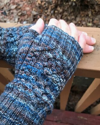 These casual mid-length fingerless mitts feature a braid and cable panel interlinked over the top of the hand with comfortable ribbing for the palm and stockinette for the thumb.