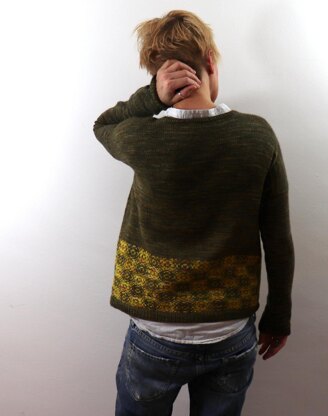 interstellar is worked seamlessly from the top down. Knitting starts from a cast-on at the shoulders. Short rows are used to shape the shoulders, then both parts are joined to work the back down to the underarm. Stitches are then picked up at the shoulders to work each front to final neck cast on that closes the neck. The front is then worked down to the underarm. Back and front are joined at the underarm and worked in the round to the colorwork hem. Sleeve stitches are picked up around each armhole and sleeves are worked from the top down in the round to the cuffs. The neck finishing is worked last.