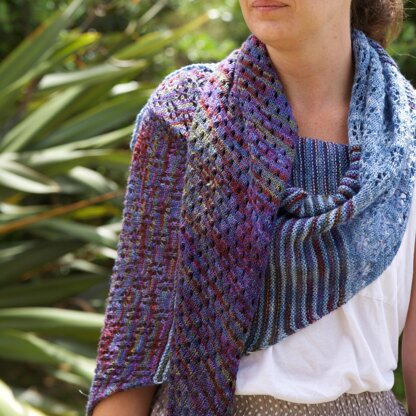 This lightweight summer shawl is inspired by the incredible colours and landscape of Tongariro National Park in New Zealand. Mountain peaks form a dramatic backdrop against hard blue skies, and flurries of snow drift about, settling on the stiff alpine grass and on delicate flowers that stretch out into the horizon.