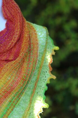 Iridescence is an asymmetric triangle with bands of lace along the long edge, designed in conjunction with Earthfaire and The Unique Sheep.
