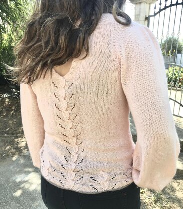 La maglia “IRIS” ha una costruzione top down. La lavorazione della prima parte è stata eseguita con giri di andata e ritorno e successivamente unita e lavorata in circolare. L’apertura posteriore è rifinita con piccole trecce che man mano si uniscono a un motivo centrale intrecciato e traforato, lo stesso motivo si espanderà più avanti su tutta la circonferenza creando delle leggere onde di rifinitura. Gli aumenti realizzati sul davanti creano un piacevole movimento senza segnare troppo la figura. Ha maniche ampie e leggermente arricciate e rifiniture con colore di contrasto. Sono certa che vi piacerà realizzarla e ancora di più indossarla!