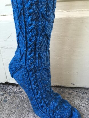 Inspired by the Addams Family, these socks are worked cuff down with a cabled chain column and stylized fence represented by twisted stitches.