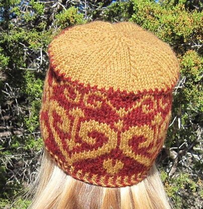 This sweet hat combines two of my favorite things—hearts and ornate iron scrollwork. As I am a knitter, not a smith, I have used my needles to forge yarn into a hat.