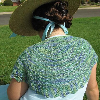 Beginning with three stitches, the main body is knit in a lacy ribbed stitch from the top down. The lower edging is then worked perpendicularly to the body. No bind off on this edge is needed because the live stitches are consumed as the edging is knit on.