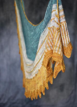 The large triangular shawl is knit top-down in one- and two-color brioche and garter stitch short rows. The contrasting stripes have tiny and larger bobbles and the border features a spiky brioche edge.