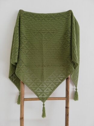 This modern geometric design is made using filet crochet technique, alternating stripes in double crochet with lacy triangle pattern. Beautiful color, simplicity of the crab stitch edging, and the tassels at the corners, give the shawl a timeless, minimalistic look.