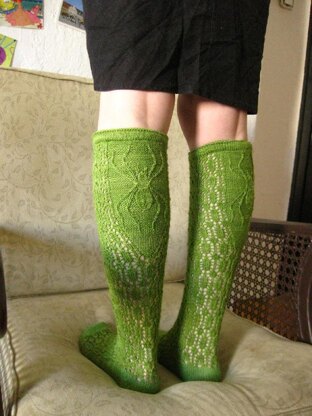 I'm one of those girls how was always fascinated by spiders. So I put my love for spiders and knee high socks into one pattern. The lace pattern is easily memorized and just when knitting knee highs get's a bit boring the calf is knitted with the large spider on it. Knitted toe up so you can adjust the calf and foot length to your specific needs while trying on the knee high, explaind in pattern.