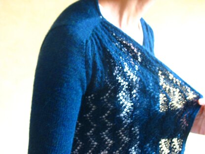 A-line swing cardigan with vine lace on the front.