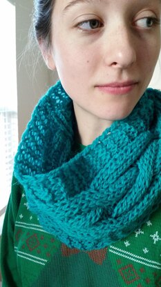 Using Aran-weight wool on US#13s, this cowl uses 220 yards of yarn to create a cowl long enough to wrap twice around the neck without being too tight up against the neck.