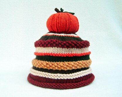 A great stash-buster hat with textured stripes in bright Autumn colors. A perky pumpkin perches on top. Knit in the round using simple knit and purl stitches to create texture. The pumpkin, stem, and vine tendrils are knit separately and then sewn on.