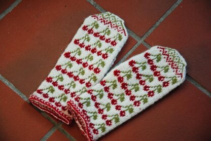 This is a pair of stranded knitted mitten starting with a Latvian braid. The pattern contains instructions for the Latvian braid, kitchener stitch, charted instructions and written instructions.