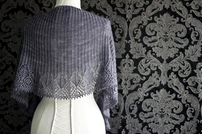 Jackson Square is a shallow, crescent-shaped shawl that's worked from the top down, beginning with a garter tab cast-on. The neat columns of twisted ribbing in the body flow into a lacy point-and-spear edging reminiscent of the wrought iron fences bordering Jackson Square in New Orleans' French Quarter.