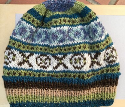 Whether you like walking on wintry days, cycling through the park or having an outdoor adventure then this hat will keep you warm and looking stylish. There are both written instructions and a chart for the fair isle. The pom –pom is optional but would be great for teenagers and their parents alike. The pattern uses 6 colours but no complete balls are required.